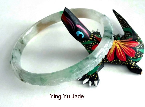 Rare large carved Chinese jade bangle bracelet. Varied shades of green related to liver meridian with white related to lung meridian and honey related to heart and spleen meridians.